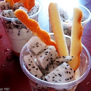 准备一次性杯子,面包屑打底,加入酸奶、蜂蜜、山楂片,面包条、火龙果有啥加啥。