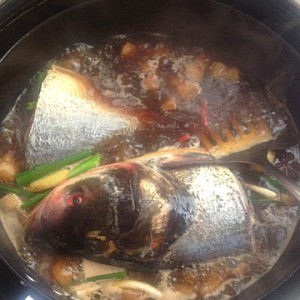 煮至汤汁剩下三分之一时,将鱼放入锅中