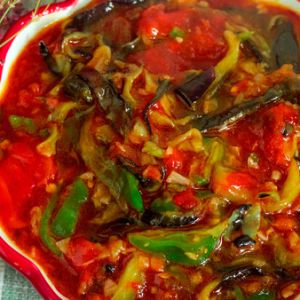 首先需要准备:茄子 西红柿 青椒 蒜末 番茄酱 白糖 生抽 玉米淀粉 盐