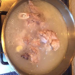 另起一锅放入焯水的大骨头,加料酒,姜片,热水大火烧开,转小火慢炖