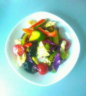 最后一步就是把所有蔬菜木耳,苦瓜,圆白菜,紫甘蓝,彩椒,小西红柿(中间切开),黄瓜都放到大盆里,然后把汁倒进去拌匀。放置十分钟后菜都入味了即可。