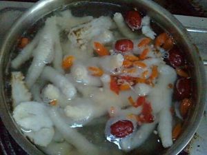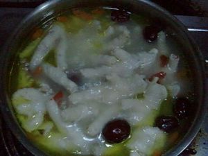 将鸡脚放入煮沸的药汤中,加入料酒,鸡精,盐调味