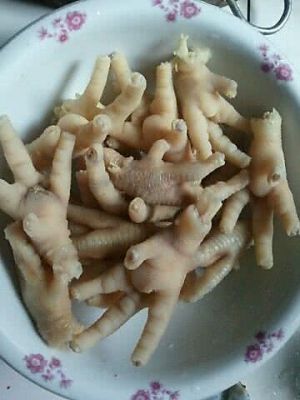 将鸡脚洗净,去尖,在冷水锅内加入生姜,料酒,盐少许,煮沸后将鸡脚倒入,大火煮一分钟后捞出,用凉水洗净备用。