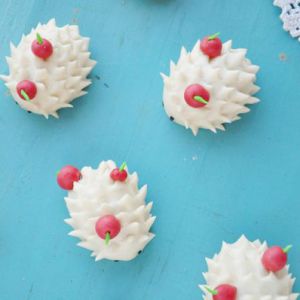 白面团平均分出大小一样的面剂子,揉匀后捏出刺猬身体,用黑面团装两个眼睛。