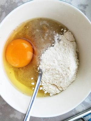 将鸡蛋,一点面粉,香蕉泥和少量水放到一个碗中准备搅拌。一岁以内预防蛋清过敏,可以只用蛋黄。