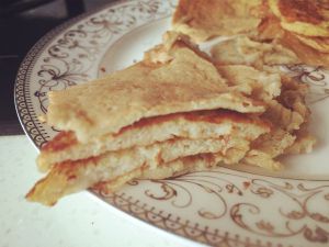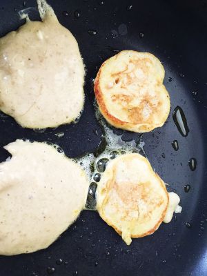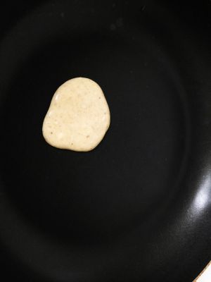 锅加热后放一点点油,不粘锅也可不用油。锅热转小火,用小汤勺取面糊摊在锅里。