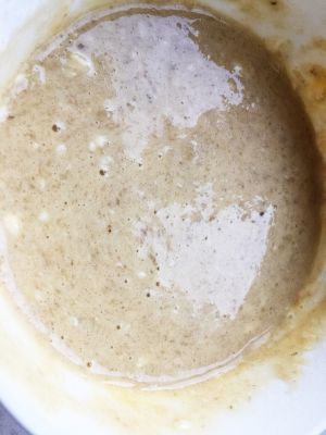 搅拌均匀后,准备摊饼。水多一点稀一点,饼就薄一点,水少稠一些,就厚一点。