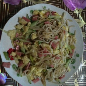 锅烧热加入葱花爆香,(油要多加点,防止面条粘锅)再加入凉好的面条用筷子翻炒,炒大约半分多钟加入少许味极鲜,少许盐(依个人口味添加),随后加入切好的鸡蛋,火腿丁,黄瓜条,翻炒片刻装盘即可。。。一盘美味的炒面就大功告成了。。。美美的吃一顿吧。。