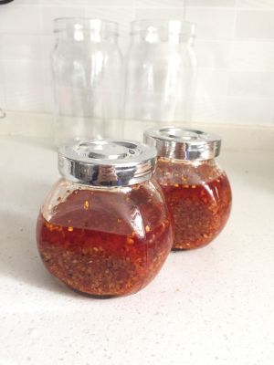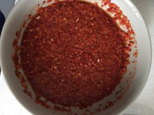 辣椒面中倒入冷水让辣椒面湿润,多一点也没关系。