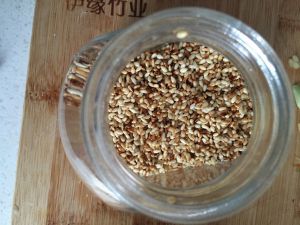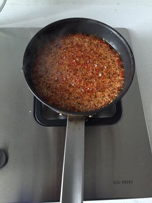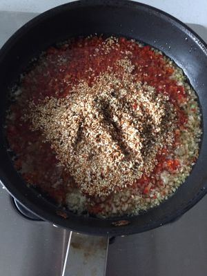 开小火放入蒜末姜末爆香,再倒入辣椒面和芝麻。