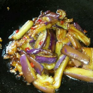 把蒜泥炒香,把酱油倒下去。茄子也一起下去。熟了就可以起锅咯。