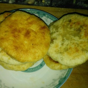 500g面粉,250-280g温水,盐2g,糖5g,加入面包机,自动和面后,发酵30分钟,就可以开始烙饼了。面要稀点,这样饼才软而且第二天吃不发硬。