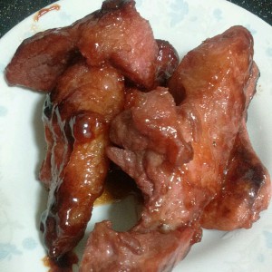 酱腌制好的叉烧用平底锅慢火煎熟,直到两面有点金黄就好了,余下的酱汁加蜜糖搅拌均匀和叉烧一起煮沸即可