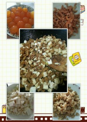 炒锅烧热倒猪油2大匙,在放入2大匙蒜泥爆金黄,放入2大匙油葱香炒香,加入萝卜丁炒香,倒入笋丁,虾米炒匀,加入3大匙卤肉汁,五香粉1小匙,白胡椒粉1小匙,高鲜少许,炒2分钟入味盛出备用(包粽子用第二份完成)