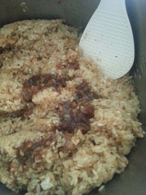 2蒸好倒入大盆内,将上步骤的卤汁一点点加入快速拌匀