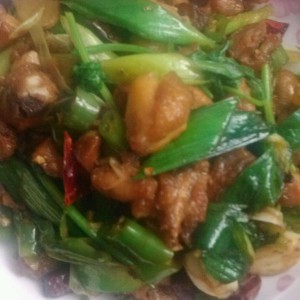 锅里加适量油烧热,鸡肉下锅炸至今黄色,捞起放入辣椒,蒜苗,翻炒10分钟即可