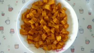 南瓜切丁蒸熟。