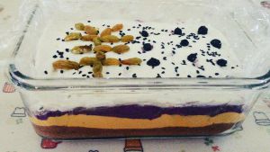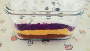 糯米粉分别与红豆馅,南瓜泥,紫薯泥,糖粉混匀,擀成片逐层铺好。