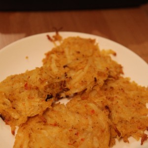 锅内放油加热,放入团成饼的土豆面团。小火煎至两面金黄,可根据口味配番茄酱或其他小料。