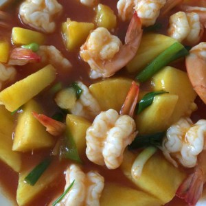 干净锅,加菠萝水、番茄酱、糖慢慢搅动,加入油淀粉,待略微粘稠就可以放抄好的虾了,再放入菠萝块葱姜,盐,欠汁裹上后就可以出锅了。