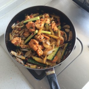 放入炸好的虾 土豆条 黄瓜条 撒入适量白糖调味 翻炒均匀 出锅