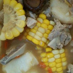 砂锅放入水,排骨,玉米块,山药块,姜丝,香菇,枸杞,大火烧开后,转小火慢煮30-40分钟