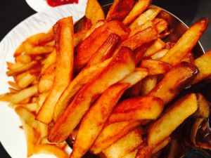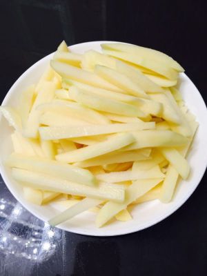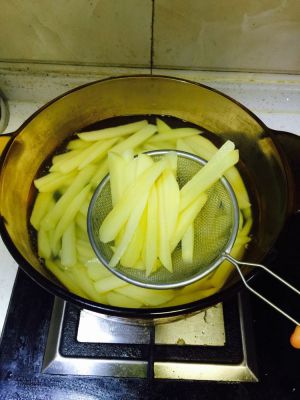 记得一定要一直用大火炸,我开始怕炸糊,一直用小火,结果土豆条一直软软的,炸不硬,后来改用大火,没多久就变黄变硬了