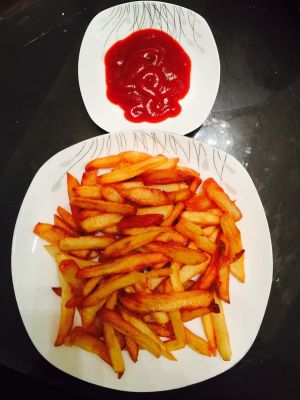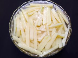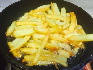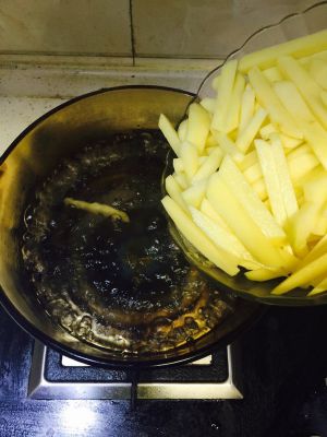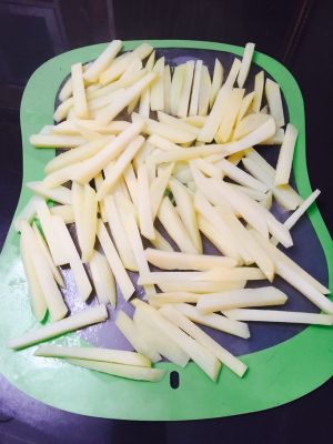 我是冷冻了24小时,第二天把土豆条取出,热锅放足够量的油,油七分热时放入土豆条,大火炸