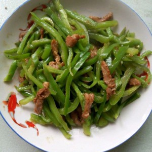 油热后加入肉丝,炒至肉丝变色加入青椒。加盐,鸡精翻炒。起锅。
