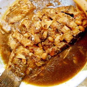 锅冒青烟时放鱼开始煎,两面油煎,然后沿锅沿边倒热调好的汁(老抽+料酒+一点醋+腊八豆酱),放大蒜生姜丝,盖盖煮。