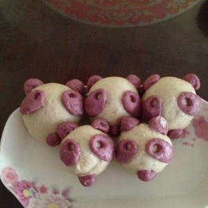 把紫薯面弄成眼睛和嘴,贴到白色面团上,放锅里蒸上15分钟到18分钟,