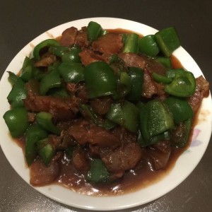 青椒切块,牛蹄筋切块。