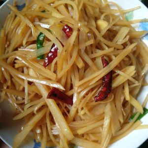 锅里放油,放入姜片,蒜,辣椒爆香,倒入土豆丝,加入1勺盐,老抽,鸡精,料酒,醋沿锅边倒入,翻炒一分钟即可出锅,切的细很容易熟哦