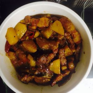 改小火炖,炖的期间将土豆切块,切好后放入锅里,加入调味料,等到汁比较少的时候加入葱,洋葱。