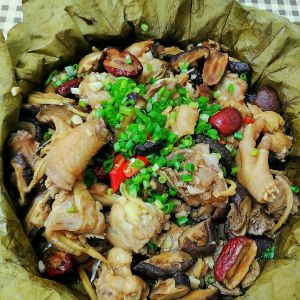 把浸泡好切好的香菇和红枣一起放入鸡肉,倒在荷叶上。包好,放在蒸笼,蒸15分钟左右。