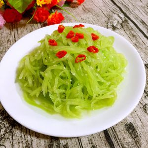 焯好水的莴笋丝迅速放入冷水中冲洗2~3遍,保持莴笋丝的脆感!