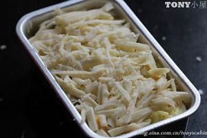撒上马苏里拉奶酪。放入烤箱,220度,烤15分钟左右到芝士稍微有点焦的感觉。