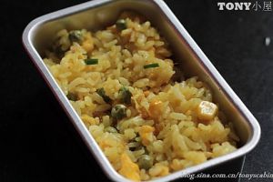 把炒好的饭放入一个适合于烘烤的盒子里。