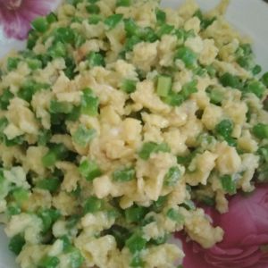 加入打散的鸡蛋,翻炒至鸡蛋成型