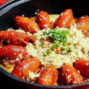 龙虾炒完后,盛出,不用洗锅,再倒入油,把葱蒜倒进去炒