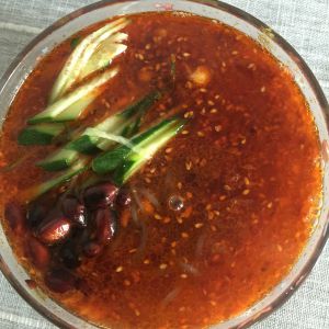 粉条好了后放入已经放好调料的碗中 加入黄瓜丝。来吃喽。 很简单对不对。味道也炒鸡好哦。辣椒我没有耗。直接放的我们家乡的特产 牛肉耗辣椒。本身这个辣椒酱里也是有花生碎的。裙子不炒花生也是可以的 放入这个酱 口感更丰富了一层呢~