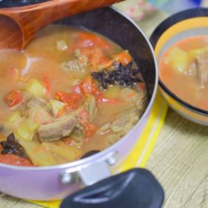 土豆和番茄加2碗半水,可以事先炒牛腩的时候开大火煮一下