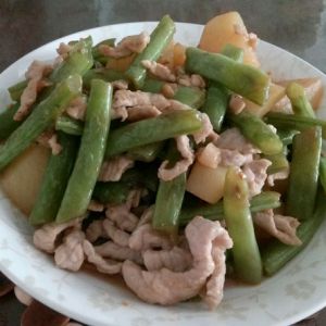 将豆角掰成段,尽量把旁边的线去掉。土豆切成条或菱形块都行,肉切丝用料酒和淀粉拌好,大蒜切成碎,不用切的太细。