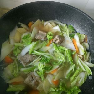 排骨在锅里烧一下,添水煮依次放菜,我先放的是胡萝卜,圆葱,马铃薯,最后放的白菜。(白菜.马铃薯.胡萝卜都是自己种的