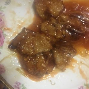 锅里放少量的油下葱姜丝煸炒一下倒入碗汁,待锅沸腾之后倒入炸好的肉翻炒均匀就出锅了,虽然卖相不咋的,儿子说味道不错