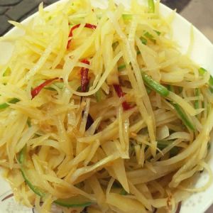 热锅凉油,先下葱姜蒜末爆香,再加干辣椒煸炒,放土豆丝后立刻点少许醋让土豆丝保持脆嫩,盐,鸡精调味,最后出锅前加青椒丝翻炒两下出锅