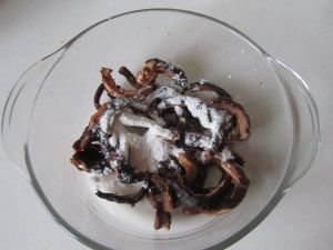 加适量的盐拌匀,腌渍5分钟后撒入干淀粉拌匀,使每条“鳝鱼丝”都均匀沾上干粉;