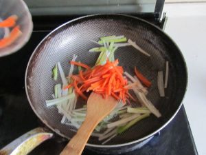 起锅热油,下入葱姜蒜爆香, 再放入红萝卜一起翻炒;