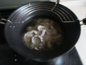 锅中烧热油,下入蘸匀干粉的“鳝鱼丝”炸制,炸至干硬定型后捞出;