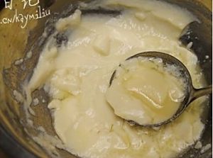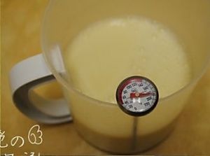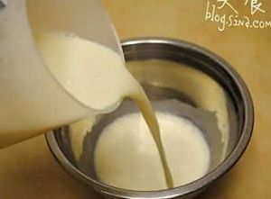 在豆浆温度稍稍降为摄氏85度左右(约华氏185度左右)时,将装豆浆的容器稍微提起至高处,往装有均匀石膏粉浆的深盆里冲。